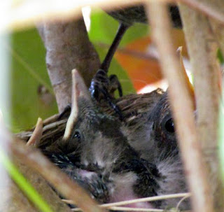 The black birds nesting at the front of my house have hatched and are growing fast. I have managed to set up my camera inside of the house and by using the 35 x optical zoom I am able to sit some distance away to take pictures of the chicks development. Although I am within the house with the lens being set up to protrude through a gap in the wooden blinds, the parent birds are all too aware of my movement, although they seem little concerned, or even the vehicles and people that move closely by their home. Instead they sit nearby with beaks full of worms waiting for their moment to return and feed.